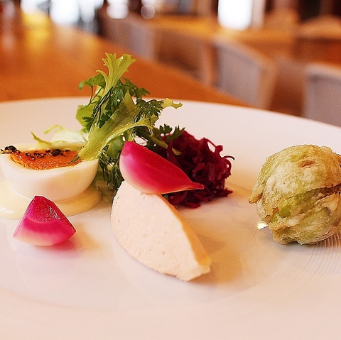 紫キャベツのマリネと半熟卵のメランジュサラダ サーモンリエット、ペコロスのピクルス、ふきのとうのフリットホタテのムース ☆ディナーコースやランチAセット(2,600円)、ランチBセット(2,200円)でお得に召し上がれます。