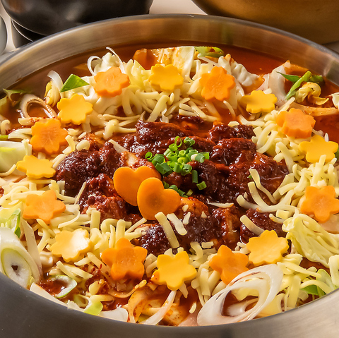 【チーズがのびてSNS映え間違いなし♪】鶏肉と野菜をコチュジャンベースの甘辛いタレで炒めた「タッカルビ」に、とろける「チーズ」をたっぷり絡めて食べる当店大人気の韓国料理です。甘辛いタレとチーズの濃厚さが相性抜群で、辛いものが苦手な人でもとっても食べやすいです!デートや女子会、各種ご宴会でもぜひ、心ゆくまでご堪能ください♪