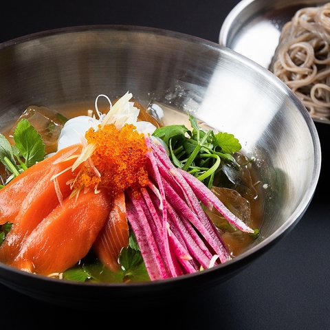 韓国語で「水刺身」と呼ばれる料理。魚介の刺身と野菜を冷たいスープでいただく料理です!酢味噌をかけるとさらに美味しさUP!〆には韓国冷麺をお出しします!これからの季節さっぱりとしておすすめの一品です♪