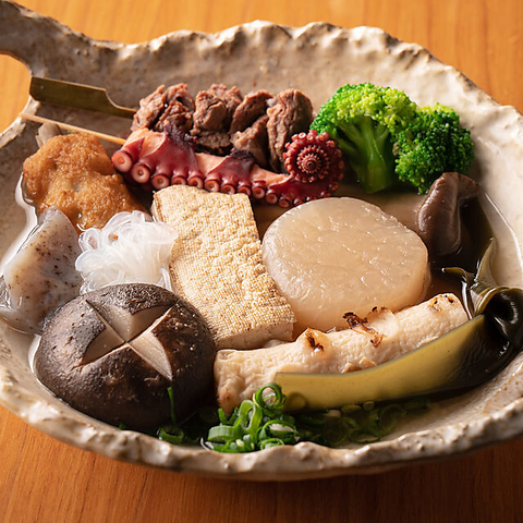 当店自慢の「特製おでん」は鹿児島県枕埼産の上質な鰹節と北海道産利尻昆布を使用したこだわりのおでん出汁で、じっくりと煮込んでおります。特に出汁がしみ込んだ「大根」や「玉子」は外せない逸品◎定番の具材はもちろん、ブロッコリーなど変わり種もご用意しております。アツアツの美味しいおでんは日本酒や焼酎との相性も抜群!