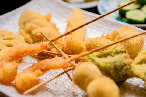 揚げたてアツアツの串揚げを、心ゆくまでお楽しみください! サクサクの衣に包まれた、ジューシーな串揚げ。 お酒との相性も抜群です◎