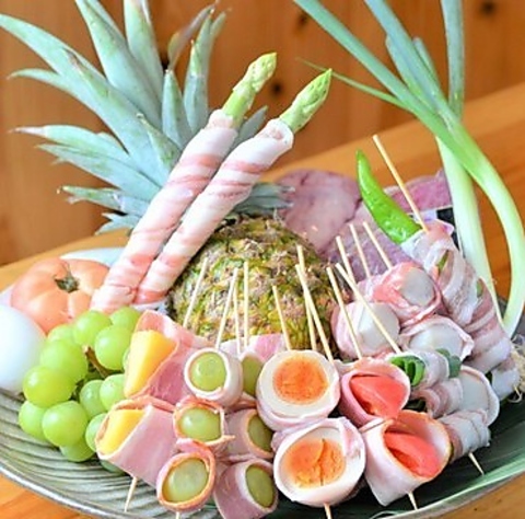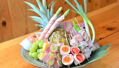 こだわりの食材を豚バラで巻いた自慢の串焼き♪旬の果物や野菜、パイナップルなど珍しい食材も楽しめます!