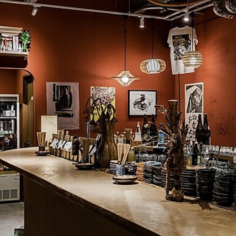 鳥居カラーの壁面がアクセント! バラバラに見えて、実は深い統一感。心地よい時間を立ち飲みスタイルで♪