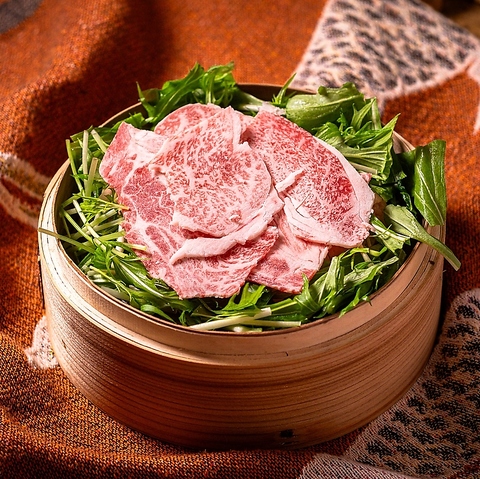 和牛をせいろで蒸して、下に隠れたタレ飯と自家製の泡を絡めて召し上がれ!写真映え◎