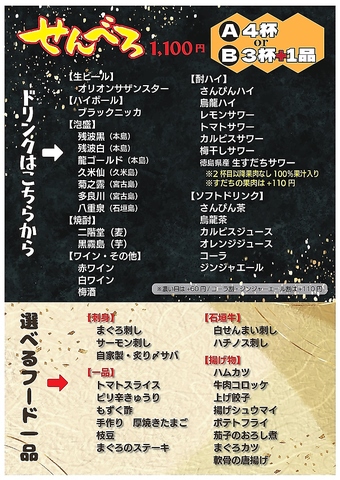 コスパ抜群の「せんべろ」が、ホットペッパーからのご予約でさらに豪華に!1,100円で「ドリンク4杯」または「3杯+フード1品」が選べる基本セットに加えて、今なら限定クーポン利用でさらにもう1品フードを追加可能です。石垣牛の白せんまい刺しや揚げ物など、自慢の一品料理を心ゆくまでお楽しみください。