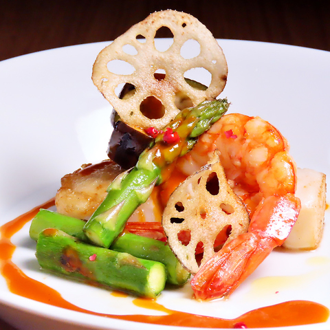 その日のおすすめの海鮮をお客様の目の前で焼きあげます。海老の出汁とトマトで作ったアメリケーヌソースを絡めてお召し上がりください。