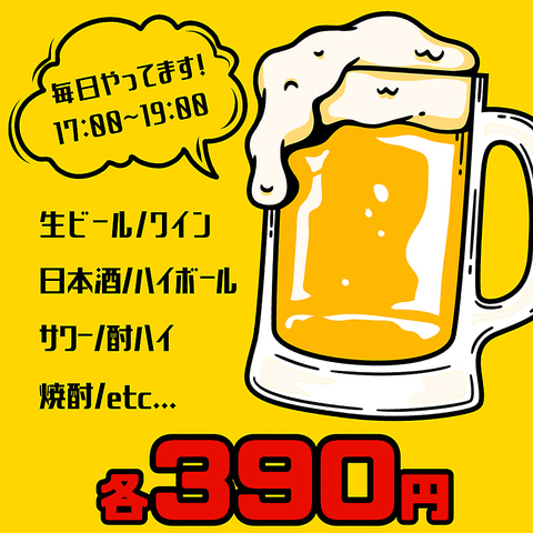 19時までグラスドリンク全品390円!ハッピーアワーを毎日開催中♪生ビールやワイン、日本酒も対象です◎