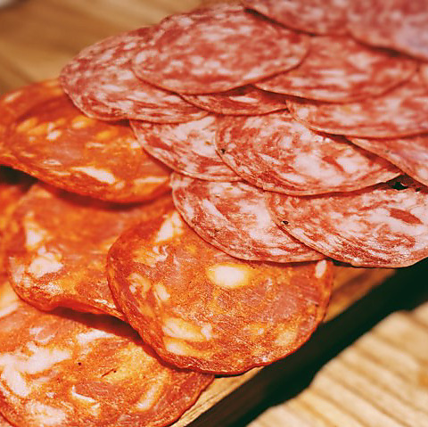 酸味が少なく塩気がまろやかな"ミラノサラミ"や、表面を軽く燻製にかけて長期熟成させた"燻製生ハムのスペック"など、香辛料や調理の技巧を凝らした料理をご用意しております。チーズや小皿料理とセットで是非ご注文ください。