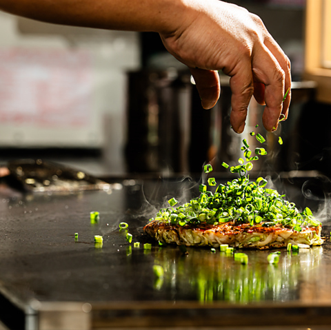 目の前で焼き上げるお好み焼きは、ふっくらとした食感が特徴!焼きたての香ばしさが漂い、ライブ感あふれる演出が食欲をそそります♪あなたの好みに合わせてトッピングを選べるのも嬉しいポイントです★