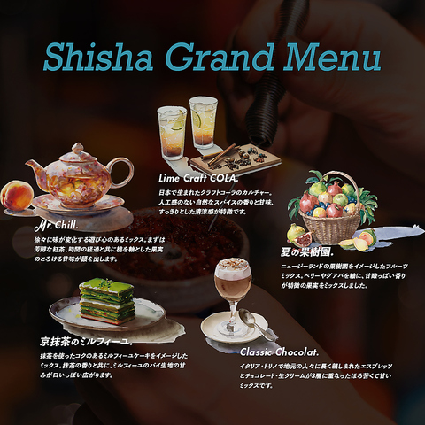 初めての方にもオススメなMr.Chillオリジナルのミックスを中心に、専用の木製台や本格的なダークリーフまで幅広く取り揃えております。平日の13:00-18:00までにご来店のお客様は1,500円でご注文いただけます。