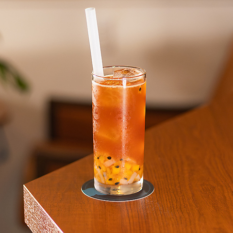 果実がふんだんに入ったストローで飲むボリューム満点の本格的なフルーツドリンク。台湾産のパイナップルとマンゴー、パッション、そこに食感の楽しいナタデココをミックスしました。ベースドリンクはジンジャーエール/紅茶の2種類。