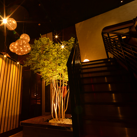 店内に足を一歩踏み入れると、間接照明とシンボルツリーが迎える、落ち着きのある和モダンな雰囲気!デートや女子会、会社帰りの一杯まで、どんなシーンでも自然と気分が上がる居心地の良さです!
