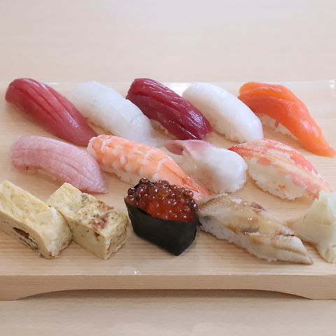 熟成大トロ、熟成中トロ、熟成マグロ、イカ、白身、エビ、サーモン、いくら、穴子、貝、カニ、飾り玉子