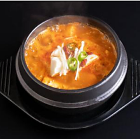 キムチ、ナムル、韓国海苔、サラダはおかわり自由です。 ご飯大盛無料!熟成キムチと豚バラ、豆腐の旨辛チゲ