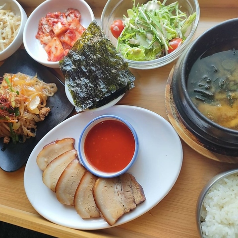 キムチ、ナムル、韓国海苔、サラダはおかわり自由です。 ご飯大盛無料!※写真の白ご飯はつきません。