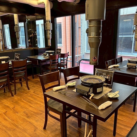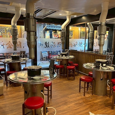 【1階フロア・4名テーブル5卓と2名テーブル1卓】レトロで活気のある雰囲気の1階フロア。4名様テーブル席が中心で、友人とのカジュアルな焼肉利用や、サクッと飲みたい時に最適です。