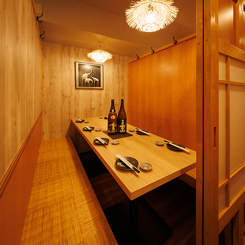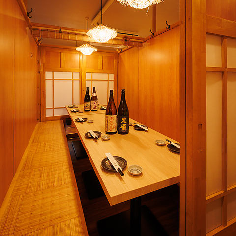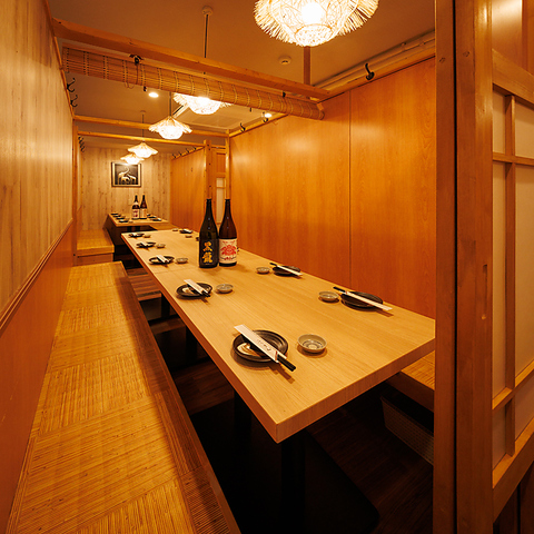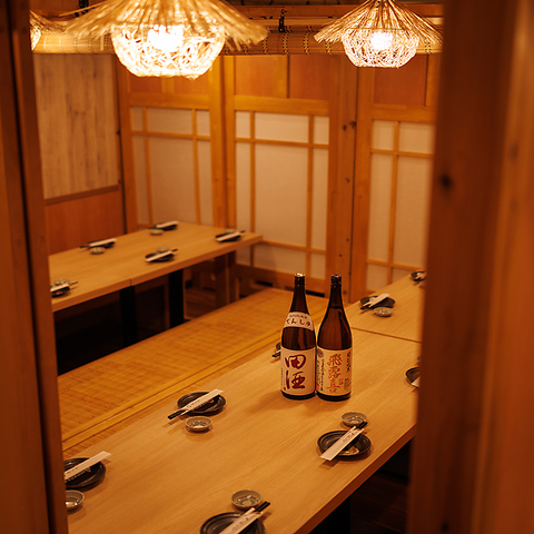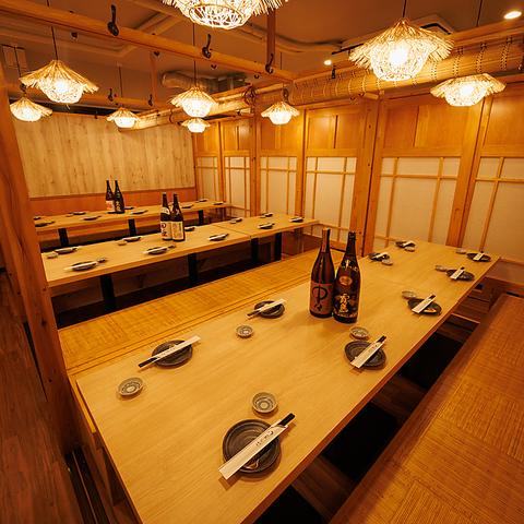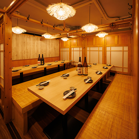 木の温もり感じる個室でまったりリラックスしながら楽しめる空間!柔らかな照明のもと、宴会・飲み会・接待・女子会・合コン・歓送迎会をお楽しみください!自慢の創作料理と美味しいお酒を囲めば、自然と笑みがこぼれるひとときに!仲間との飲み会や会社の宴会、ちょっと特別な夜にもピッタリの個室居酒屋です!