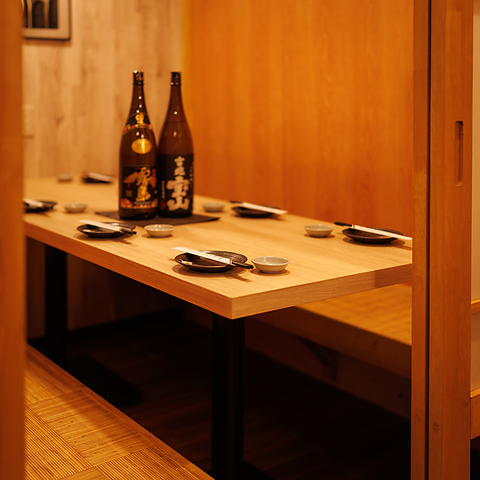 通路を挟みますが、横一列で座れる個室!木の温もり溢れる個室空間は、居心地の良さも抜群◎!広々テーブルで大人数の宴会・飲み会もゆったり楽しめます!優しい照明に包まれながら、美味しい料理とお酒で乾杯すれば、自然と笑みがこぼれるはず!友達同士の飲み会や会社の宴会にもピッタリな、使い勝手抜群の個室空間です!
