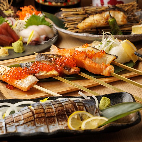 宴会・飲み会に最適な飲み放題付コース多数!名物の炭火焼き魚串・炉端焼き・仲卸直送鮮魚が味わえます!