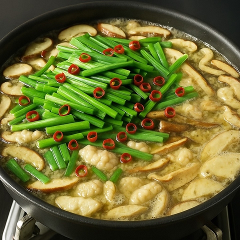 炙ったもつを入れる当店の看板メニュー。余分な脂を落としつつ、旨味だけをスープに凝縮。ご賞味ください!