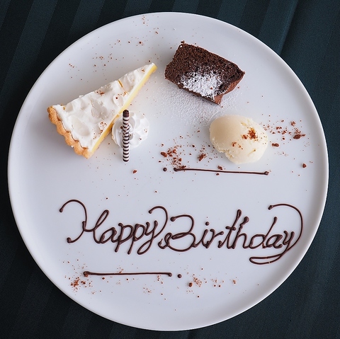 誕生日や記念日にメッセージ付きデザートプレートをご用意しております♪サプライズ演出など相談承りますのでお気軽にお声掛け下さい!※ご予算やご要望により内容の変更がございます。