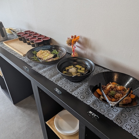 豊富なメニューをご用意しており、唐揚げやカレー、サラダをはじめ、ナムル、トマトポン酢、ポテトサラダ、春菊と厚揚げのお浸し、磯辺揚げ、茄子の揚げびたし、茶碗蒸しなど、心を込めた手作り料理を心ゆくまでお楽しみいただけます。お味噌汁やお漬物、和の食文化を存分に味わえるメニューをご用意。