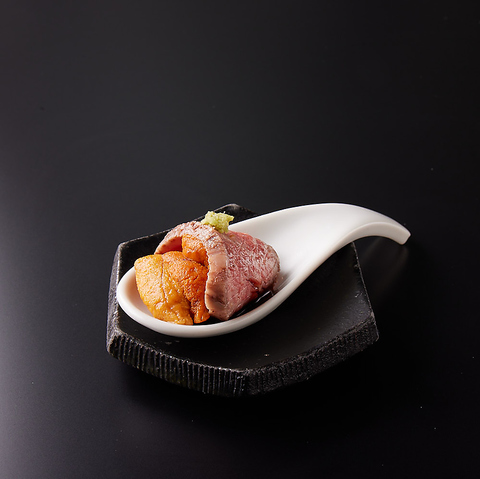 軽く炙った柔らかい希少部位の友三角とウニで一口の贅沢を。