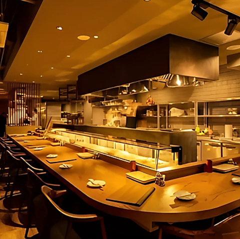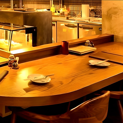 【ライブ感を楽しめるカウンター席から、掘りごたつ個室まで多彩な席タイプ】温かみのあるゆったりと落ち着いた雰囲気の店内は、少人数~団体様まで幅広いシーンでご利用いただけます。また、カウンター席から職人による華麗な手捌きを望むことができ食欲をそそります。また2名様~ご利用いただける半個室や、完全個室も。