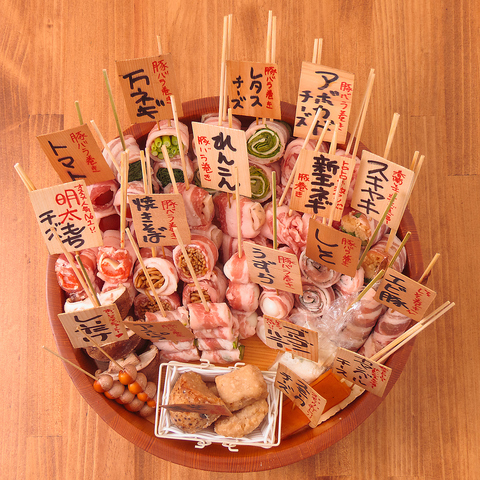 旬の野菜を豚バラ肉やベーコンで巻いた本場博多の野菜巻き串!優しくて軽い口当たりは女性のお客様を中心に当店の人気メニューとなっております。牛串や焼きとん、焼き鳥を合わせるとなんと約30種類!炭火で焼き上げた串焼きは香ばしい香りと、外はカリッとしつつもお肉の弾力とジューシーさをお楽しみいただけます♪