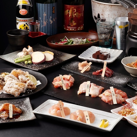 人気No.1!◎厳選部位鶏焼き・さっぱりポン酢で鶏ムネとササミ焼き◎厳選部位塩焼き(砂肝とぼんじり)◎大山鶏、さつま地鶏(地鶏モモ2種)7種の食べ比べ全9品と飲み放題コース《※2.5時間生ビールあり飲み放題付き》