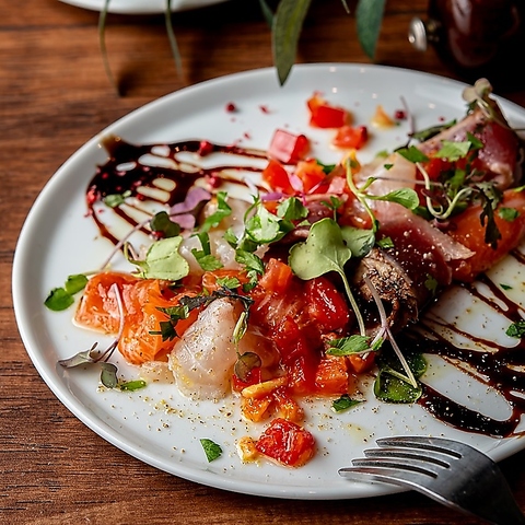 彩り豊かな前菜盛り合わせとワインで乾杯。ぜひ召し上がっていただきたいお料理です。ライスコロッケ / 鮮魚のカルパッチョ / イタリア風オムレツ / 生ハムと季節の果実 / タコとセロリのマリネ / とまとのブルスケッタ / プティとまとのマリネ / 季節の野菜 とまと煮込み