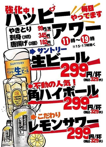 | サワー | ウーロンハイ/緑茶ハイ/グレープフルーツサワー/レモンサワー/巨峰サワー/カルピスサワー/青リンゴサワー/キウイサワー |