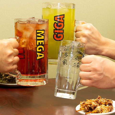 圧巻のメガ・ギガサイズも飲み放題!単品飲み放題・飲み放題付きコース共に【1時間59分】たっぷりお楽しみいただけます。ガッツリ飲みたい夜は、当店自慢のメガ・ギガジョッキで乾杯!