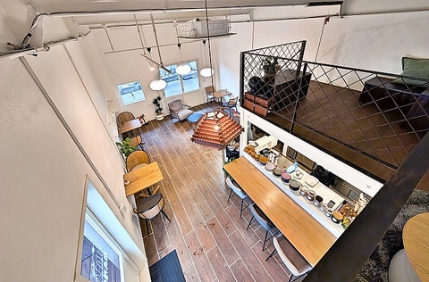 2階から眺める店内は、開放感あふれる素敵な雰囲気が漂っています。カウンター席は3つあり、一人での利用にも。静かな場所で自分の時間を楽しむことができるのが魅力です。また、スタッフとの会話も楽しめるので、リラックスできます。明るい窓から自然光が差し込み、心地よい空間が広がっています。