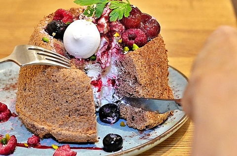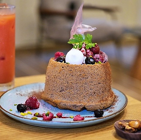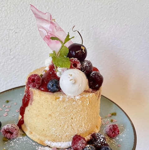 シフォンケーキにたっぷりのベリーが贅沢にトッピングされた一品