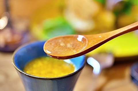 ランチに付く『ジンジャービネガースープ』はサンラータン風で酸味がアクセント。たっぷりのショウガとビネガー、 オリジナルブレンドのスパイスで、 心も体も温まります。