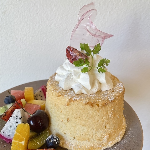 フルーツとクリームのハーモニーが広がる、夢のようなシフォンケーキ。忘れられない味わいが心に残ります。