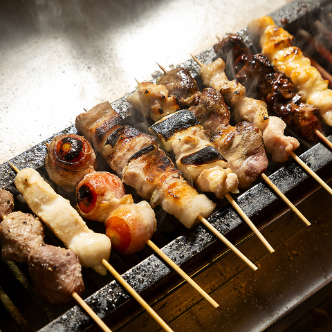 席についたらまずは焼き鳥!ねぎまや皮の定番串から巻きもの串まで種類豊富にご用意しています◎