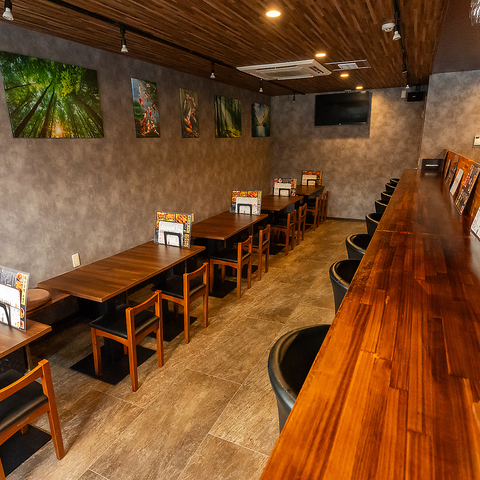 上品なカラーで統一した店内は、バーやラウンジのような落ち着いた雰囲気。クラッシック・ジャズ・ロック・HIPHOPといった様々なジャンルの音楽に耳を傾けながら、楽しいひと時をお過ごしいただけます。お席はひとり飲みにもぴったりなカウンターとテーブル席を完備。団体様向けの貸切予約も可能です◎