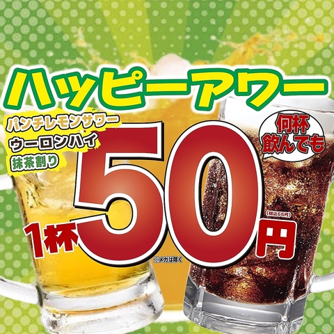 OPEN~19時迄、パンチレモンサワー・ウーロンハイ・抹茶割りが何杯飲んでも1杯55円!※メガは除く