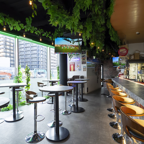 人数問わずカジュアルにお楽しみいただける空間で、こだわりの内装と全面ガラス張りの眺望が抜群。巨大スクリーンや大画面モニターでスポーツ観戦を大迫力で楽しめ、特別なひとときを過ごせます。