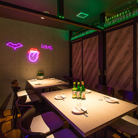 受付もネオンで彩られ、エレベーターを降りると韓国空間をお届け!