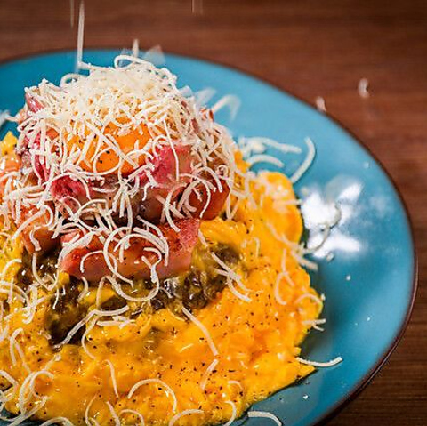 濃厚チーズとコク深カルボナーラソースがたまらない! 「鉄板カルボ和牛焼き飯」はとろ~り卵と和牛の旨味で、思わず笑みがこぼれる逸品。 オクユカシ ハナレにきたらぜひ食べてみてください!