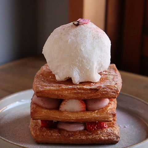サクサクに焼き上げたデニッシュ生地に、いちごと桜あんを生クリームでなめらかにのばした特製さくらクリームをたっぷりサンド。仕上げに、ぎゅうひで包んださくらジェラートを贅沢にひとつ。春の香りといちごの甘酸っぱさが重なり合う、見た目も華やかな季節限定ミルフィーユです。
