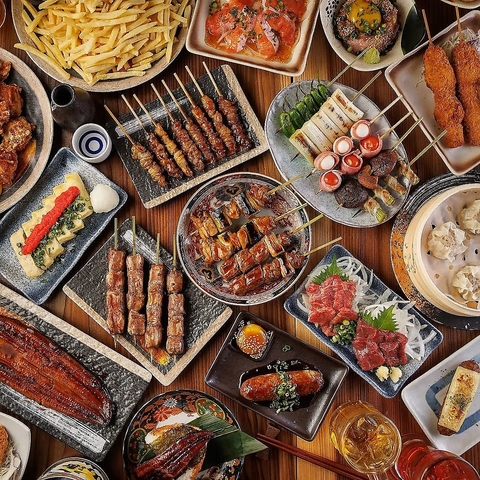 炭火で香ばしく焼き上げた自慢の焼鳥がなんと食べ放題!さらに、特製の焦がし吟醸唐揚げやサクサクポテトフライも好きなだけ!旬の前菜やサラダ、ふわふわ出汁巻き玉子、本格チャーハンにデザートまで付いた全8品で大満足のコースに、たっぷり3時間の飲み放題付き!食べて飲んで盛り上がる、宴会・飲み会にぴったりのプランです!