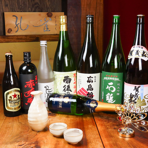 | 焼酎 (ロック/水割り/湯割り/ソーダ割り) | (芋) 黒霧島/(芋) 黒白波/(芋) 雲海さつま木挽/(芋) 大隅/(芋) からり芋/(麦) 二階堂/(麦) いいちこ/(麦) 和ら麦/(米) 白岳しろ/(そば) 雲海そば/(しそ) 鍛高譚 (たんたかたん)/(甲類) キンミヤ焼酎 |