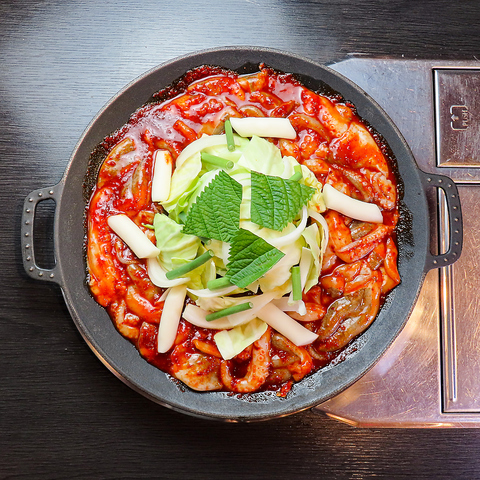栄養素が豊富なイイダコ(チュクミ)はとてもヘルシー♪旨味もたっぷりで健康に美味しくお召し上がりいただけます。旨辛に味付けした新鮮なイイダコに野菜と餅を加えて炒める韓国でも話題のヘルシーメニューをぜひ一度ご賞味ください!!