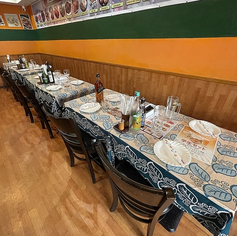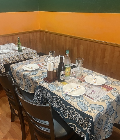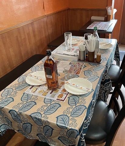 テーブル席からも調理風景をうかがうことが出来ます。店内にはお酒のボトルやオリエンタルな装飾品が飾られています。雰囲気も楽しむことも出来ます。
