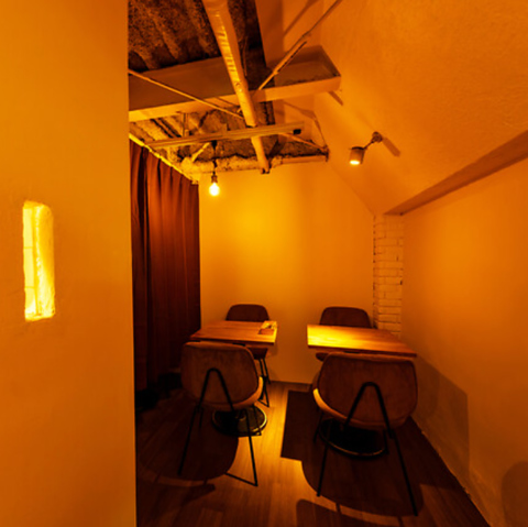 【半個室のようなテーブル席】奥のテーブル席は時間をゆったりと感じれる落ち着いた空間となっております。テーブル席を繋げればまとまったお席としてご利用できます。お気軽にお声かけください。