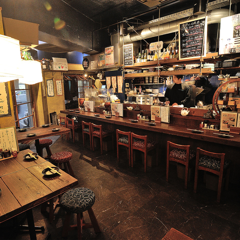 木彫りの温かみが感じられる落ち着いた空間で、心安らぐひとときを提供しています。カウンター席や広々としたテーブル席は、全て温かみのある木材を使用。ゆったり座れるテーブル席は3名様からのご予約が可能で、8~10名様の団体様にも対応可能◎プライベート飲み会や宴会にご利用ください。